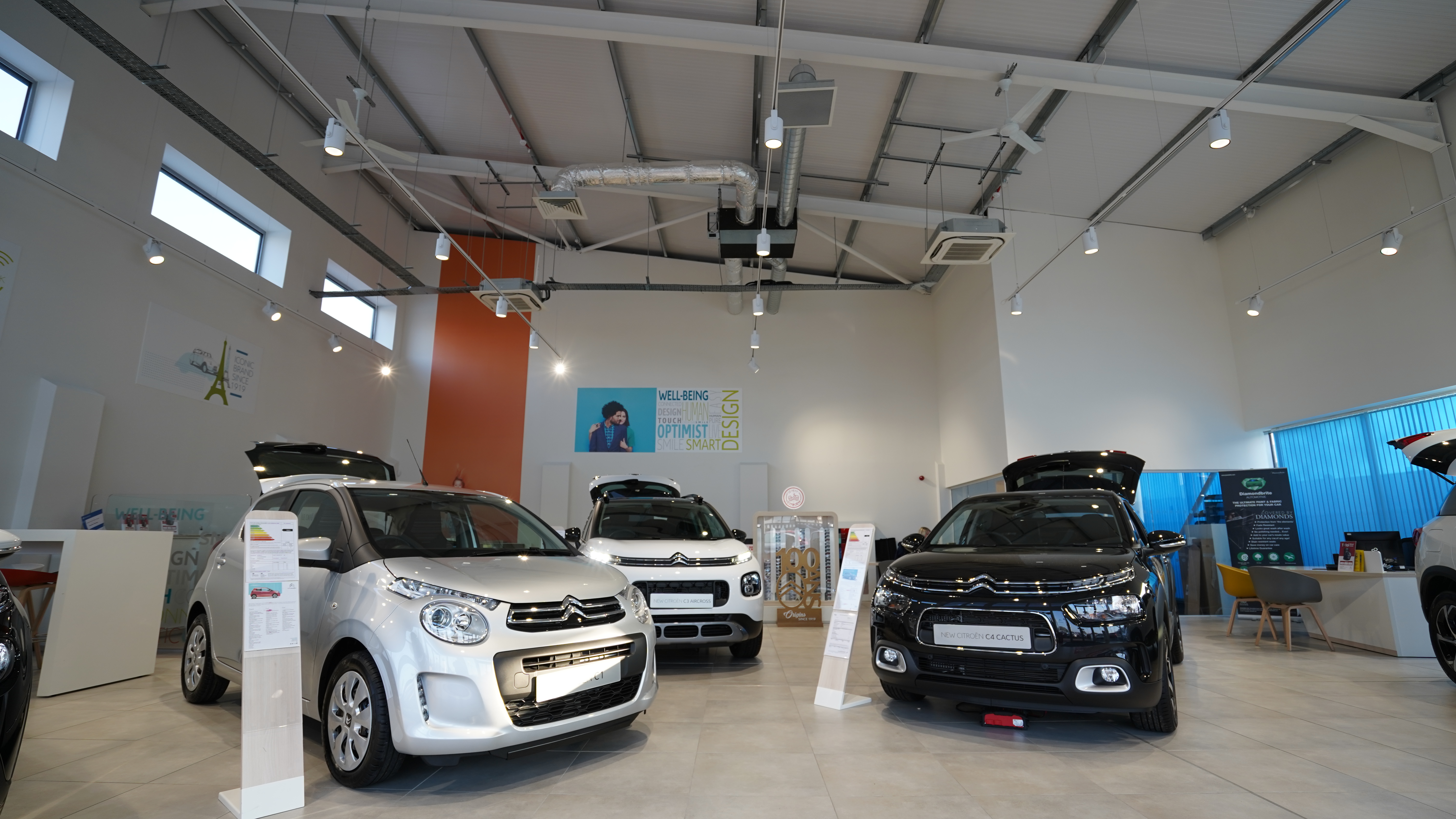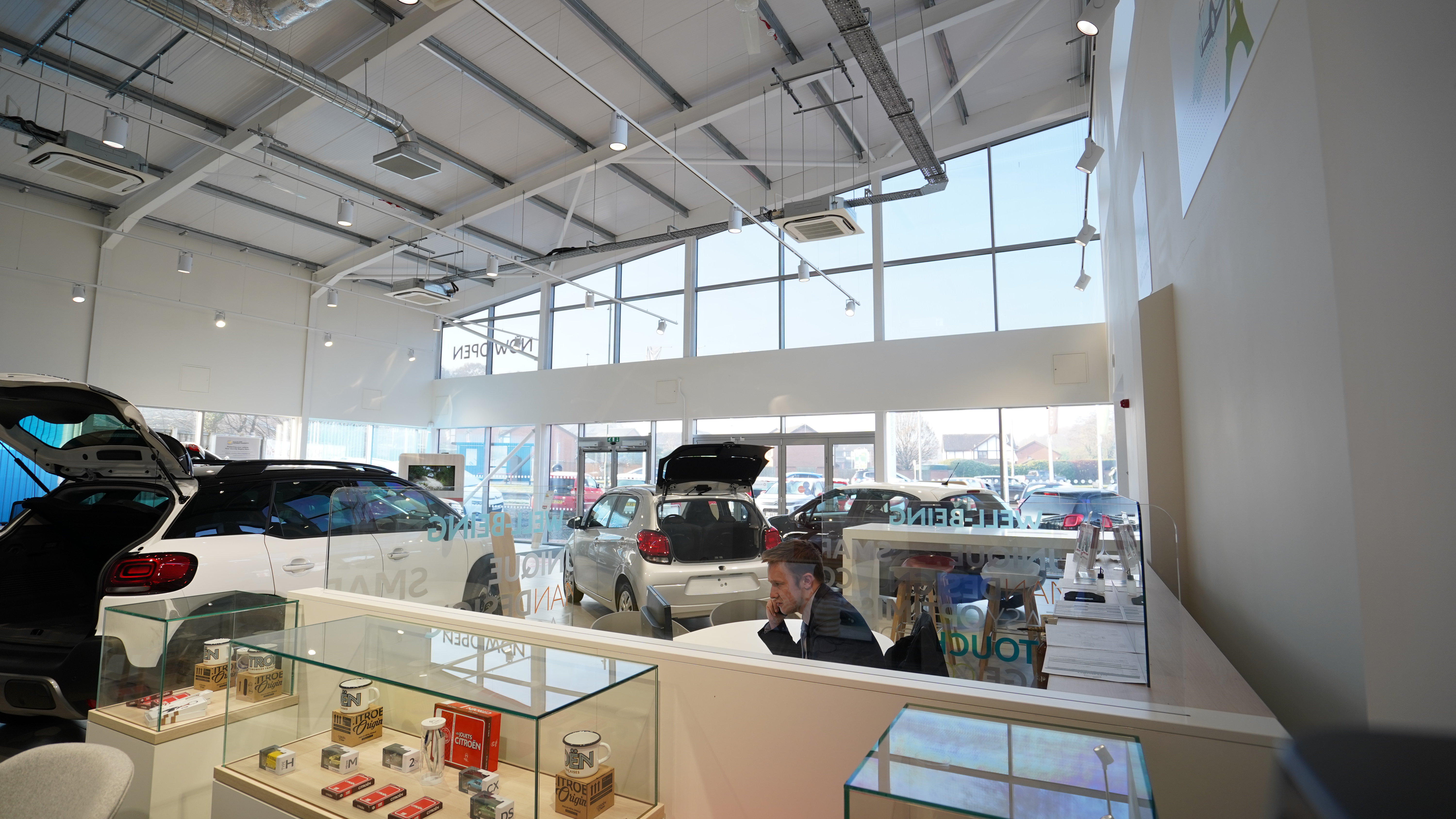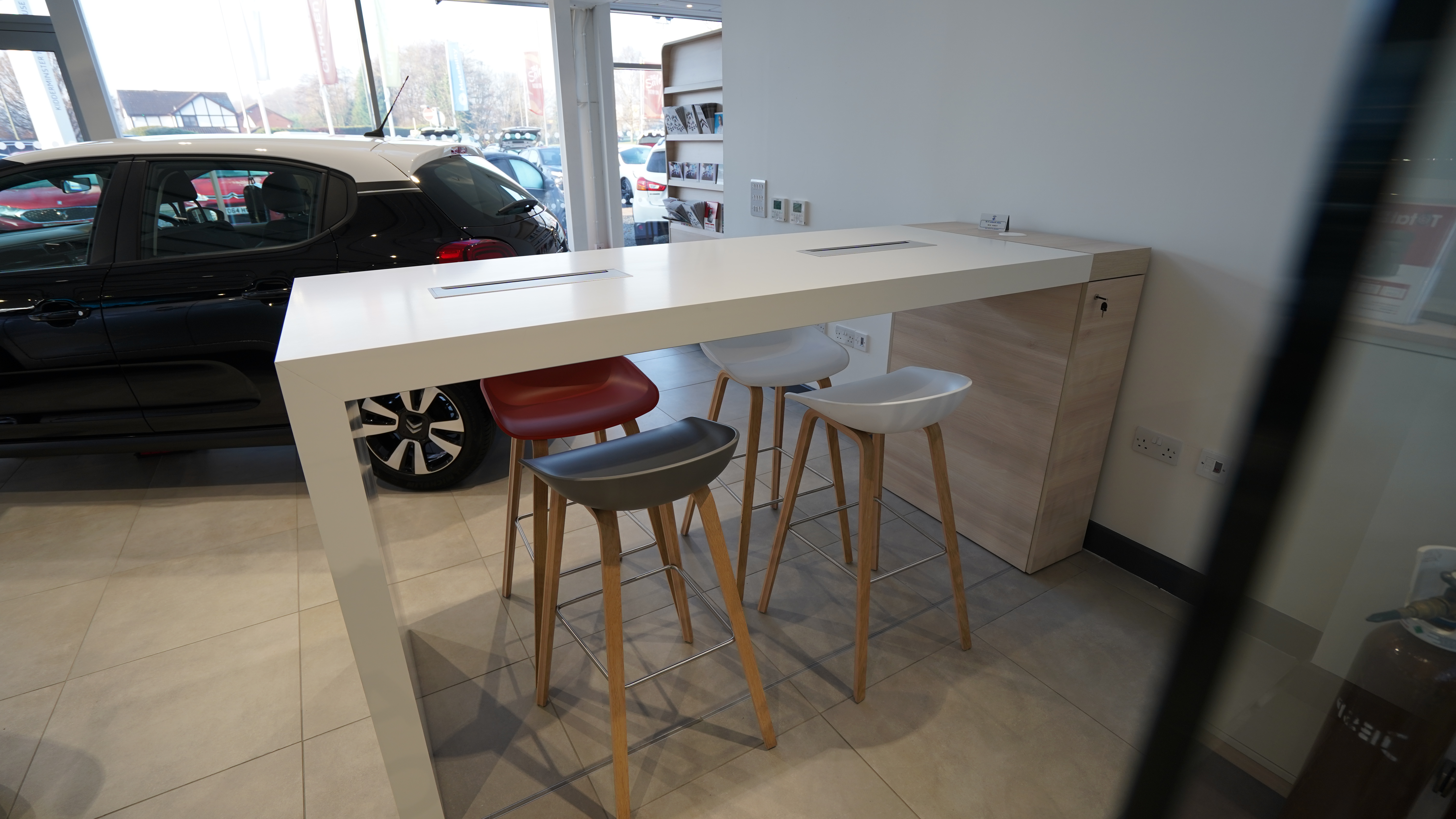 We are delighted to post a video and pictures of the works carried out at the Citroën Kidderminster Garage. We refurbed the existing showroom internally and externally which internally included installation of additional power to the floor via floor boxes to illuminate cars, new hot desks in the showroom, new floor tiles, carpets and it was also fully redecorated to suit the new corporate identity.